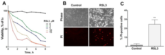 RSL3 affects the viability of SH-SY5Y cells. (A) Cells were treated with different concentrations of RSL3 for different times and viability was evaluated with the MTT assay. Viability at time = 0 was normalized to 100%. Values represent means of 5 replicates per experimental point of a representative experiment. N = 3 independent experiments. (B) Cells were treated for 3 h with 5 µM RSL3 or vehicle (DMSO, Control) and were stained with propidium iodine (PI, red) to evaluate dead cells in the population. Representative images are shown. Scale bar: 80 µm. (C) Quantification of PI-positive cells. Values represent the mean ± SD from 200–250 cells per experimental condition; *** p < 0.001.