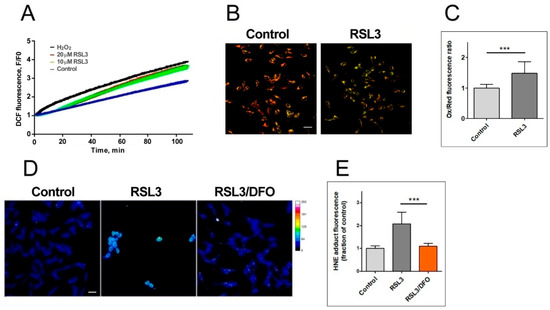 The generation of ROS was evaluated via DCF fluorescence. The addition of 20 µM RSL3 induced a robust ROS production, similar to that elicited by 250 µM H2O2 (Figure 3A). We then evaluated lipid peroxidation levels after 3 h of RSL3 treatment using the BODIPY C11 probe, which is a long-chain oxidizable molecule that inserts into cell membranes. In the reduced state, this probe emits red fluorescence (λ emission 590 nm); however, when oxidized, its emission/excitation pattern changes towards green fluorescence (λ emission 510 nm). We found that RSL3 treatment for 3 h produced a significant increase in the ratio of green fluorescence to red fluorescence compared to the control, indicative of lipid peroxidation (Figure 3B,C). Lipid peroxidation was further assessed by determining the formation of HNE-protein adducts; 4-HNE is a highly reactive aldehyde resulting from the lipid peroxidation of polyunsaturated fatty acids such as linoleic and arachidonic. We found that treatment with RSL3 increased the formation of protein-HNE adducts, and that co-incubation with the iron chelator deferoxamine (DFO) circumvented this increase (Figure 3D,E).