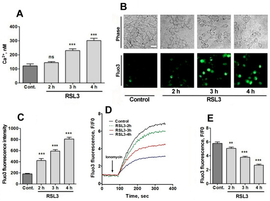 A gradual increase in cytoplasmic calcium concentration was found in cells treated with 5 µM RSL3, from about 100 nM in the untreated situation to 300 nM after 4 h of RSL3 treatment, with significant differences at 3 h and 4 h post RSL3 addition (Figure 5A). The RSL3-induced cytoplasmic calcium increase was further explored by treating cells with RSL3 for different times and then loading them with fluo-3, a calcium sensor with higher Kd than fura-2 [33]. The fluorescence intensity of fluo-3 increased in proportion to the duration of the previous RSL3 treatment (Figure 5B,C).