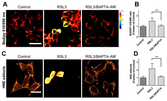 Due to the relevance of lipid peroxidation in ferroptosis, a possible causal relationship between RSL3-induced calcium upsurge and lipid peroxidation was investigated. To this end, we determined the effects of BAPTA-AM on the RSL3-induced oxidation of BODIPY C11. As previously carried out, we also measured the formation of 4-HNE-protein adducts after RSL3 treatment.
