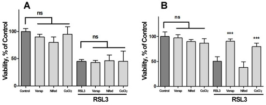 We next investigated the possible participation of calcium channels on the RSL3-induced increase in intracellular calcium concentration (Figure 7). Veparamil and Nifedipine, two L-type voltage-gated calcium channel blockers [36,37], and CoCl2, a nonspecific calcium channel antagonist, did not afford protection against RSL3 treatment (Figure 7A). In another series of experiments, the extracellular calcium chelator EGTA and the cell-permeant calcium chelator BAPTA-AM were tested as possible protectors of RSL3 toxicity. In these series, the addition of EGTA to the culture medium failed to diminish the effects on viability due to RSL3 treatment (Figure 7B). In contrast, loading cells with BAPTA-AM prior to RSL3 treatment significantly protected SH-SY5Y cell viability (Figure 7B). As a positive control, protection by DFO was also observed (Figure 7B).