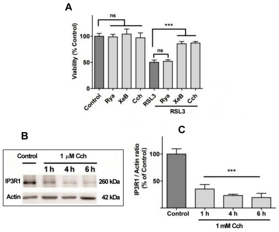 No effects on RSL3-mediated cell death were observed when cells were pre-incubated for 1 h with 100 µM ryanodine, a specific RyR channel inhibitor at µM concentrations (Figure 8A). This result agrees with the fact that the SH-SY5Y cell line used in this work does not express RyR channels (Supplementary Figure S1). In contrast, treatment with xestospongin B, a powerful and specific IP3R channel blocker, protected cells from RSL3-induced cell death (Figure 8A). The participation of the IP3R channel in this process was further evaluated with carbachol, a cholinergic agonist that reduces IP3R protein levels in SH-SY5Y cells [38]. Pre-incubation with Cch effectively produced a time-dependent decrease in IP3R1 levels (Figure 8B,C) and protected cells from RSL3-induced cell death (Figure 8A). Overall, these results indicate that RSL3 induces an increase in intracellular calcium that is mediated, in large part, by IP3R channels, and that this increase is germane to RSL3-induced ferroptotic cell death.