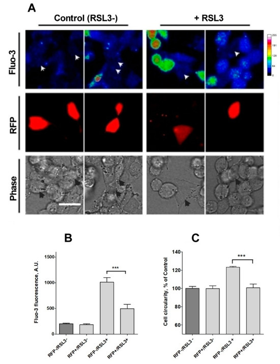Knockdown of IP3R1 reduces the increase in intracellular calcium concentration induced by RSL3. Cells previously transfected with a shRNA construct against IP3R1 with a RFP tag (RFP+) were treated for 4 h with 5 µM RSL3 or vehicle, then loaded with fluo-3 and frames were obtained with red and green fluorescence filters. (A) Representative images in thermal scale of non-treated cells (columns 1 and 2) and RSL3-treated cells (columns 3 and 4). Scale bar 20 µm. White (Fluo-3) and black (Phase) arrowheads mark the position of RFP-positive cells. (B) Quantification of fluo-3 fluorescence in RFP+ cells, which corresponds to IP3R1 shRNA transfected cells, and RFP- cells, which do not express the IP3R1 construct, without (RSL3-) or with (RSL3+) RSL3 treatment. (C) Estimation of roundness in RFP+ and RFP- cells treated or not with RSL3. Values represent mean ± SEM. Between 32 and 115 cells were evaluated per experimental condition from 2 independent experiments. *** p = 0.001 comparing the RFP-/RSL3+ and the RFP-/RSL3+ conditions. No significant changes were detected between the RFP-/RSL3-, RFP+/RSL3- and RFP+/RSL3+ conditions.