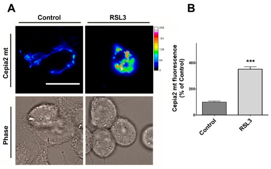 Since through mitochondria-associated ER membranes (MAMs), IP3R participates in calcium entry into mitochondria [40], the relative levels of mitochondrial calcium after treatment with RSL3 were investigated using the genetically encoded mitochondria calcium probe CEPIA2mt (Figure 10).