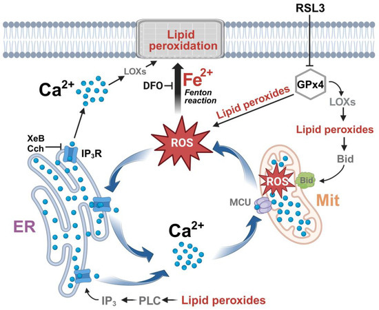 In summary, the results presented here point to an IP3R-mediated calcium increase as a mediator of RSL3-induced ferroptosis in SH-SY5Y cells. The generation of a vicious cycle between calcium and mitochondrial ROS production will contribute to the generation of toxic levels of lipid peroxides that, finally, will result in ferroptotic cell death.