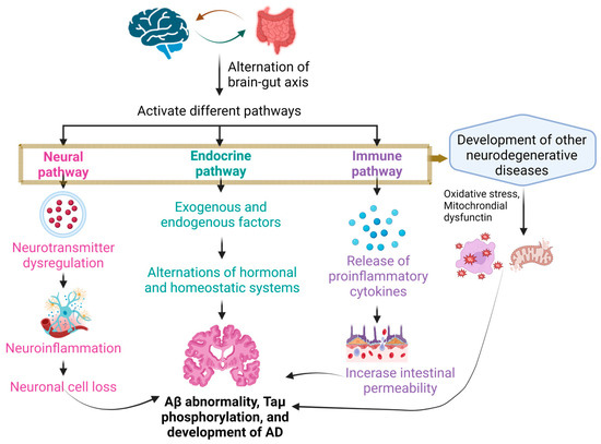 Contributing factors in the development of Alzheimer’s disease. The alteration of the gut–brain axis initiates various pathways, including neuronal, endocrine, and immune pathways, leading to disruptions in neurotransmitters and hormonal regulation. Simultaneously, the release of diverse cytokines contributes to the collective mechanisms fostering the development of Alzheimer’s disease. Ultimately, the multifactorial approach involving these interrelated processes contributes to the onset and progression of Alzheimer’s disease.