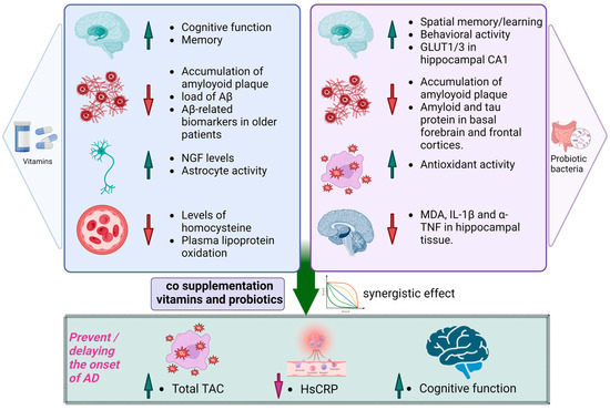 Furthermore, separate sets of experimental and clinical data have also supported the notion that disturbances in gut microbiota and its interaction with the host can contribute to neurodegeneration [34]. Research findings indicate that low vitamin levels (hypovitaminosis) have been associated with numerous human diseases, especially those that tend to emerge with age, including Alzheimer’s disease, cancer, cardiovascular conditions, type II diabetes, multiple sclerosis, and various inflammatory disorders [35]. In this review, we propose that a combined approach involving probiotic and vitamin co-supplementation could be beneficial in preventing and delaying the onset of Alzheimer’s disease.
