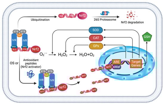 Keap1-Nrf2/ARE is a central pathway among numerous antioxidant molecular regulatory mechanisms [77] and is the most studied one for the mechanism of antioxidant peptides [78,79,80,81,82]. Keap1, as a core regulator of the pathway, can control the stability of Nrf2 based on the redox conditions in the cell to keep it exerting its antioxidant capacity reasonably. Keap1 mainly consists of a broad -complex-, tramtrack-, and bric aà brac (BTB) domain, an intervening region (IVR) domain containing multiple cysteine modification sites, and an Nrf2-binding Kelch/DGR domain that binds Nrf2 [83]. The dimerization of Keap1 is achieved with the assistance of its BTB domain by binding Cullin3 (Cul3), whereas the IVR domain bridges the BTB domain to the Kelch/DGR domain [84]. Nrf2 is a member of the Cap’n’collar (CNC) family of transcription factors, which consists of seven Neh (Nrf2 ECH homology) domains, each with a distinct function. The Neh1 CNC-bZIP domain is responsible for binding and dimerization with the small Maf (sMaf) protein; the Neh2 domain mediates the interaction with Keap1 through DLG and ETGE motifs; the Neh4, Neh5, and Neh3 domains are essential for the trans-activation of Nrf2; and the serine-rich Neh6 domain regulates the stability of Nrf2 [42]. As a specific DNA sequence, ARE can initiate the transcription of the antioxidant enzyme genes by binding to the dimerization product formed by Nrf2 and sMaf.