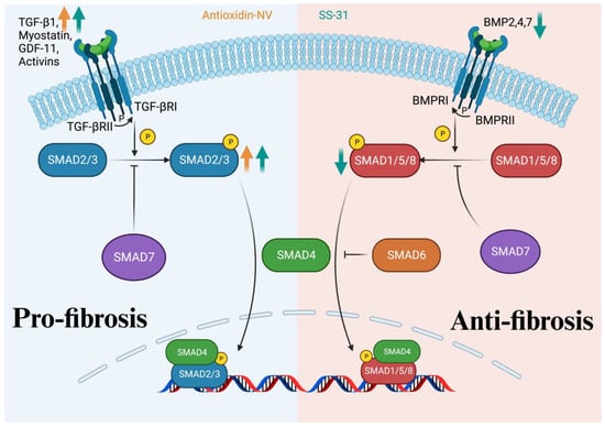 In recent years, mechanistic research on antioxidant peptides has revolved around the TGF-β/SMAD signaling pathway. For instance, a novel antioxidant peptide, antioxidin-NV, GWANTLKNVAGGLCKMTGAA (Gly-Trp-Ala-Asn-Thr-Leu-Lys-Asn-Val-Ala-Gly-Gly-Leu-Cys-Lys-Met-Thr-Gly-Ala-Ala), was identified from the skin of Nanorana ventripunctat. It significantly increased TGF-β1 levels in UVB-irradiated HSF cells and hairless mice skin in a concentration-dependent manner. Also, the levels of phosphorylated SMAD2 in UVB-irradiated HSF cells were significantly increased by antioxidin-NV. In addition, antioxidin-NV was able to rescue collagen I production significantly in hairless mice and increase the abundance and density of collagen fibers after UVB irradiation in the skin of UVB-exposed mice [25]. This evidence suggests that antioxidin-NV rescues the collagens by activating the TGF-β1/SMAD2 pathway. SS-31 could also function through activating the TGF-β/SMAD pathway. Right ventricular systolic blood pressure (RVSBP) was used as a measure to evaluate the effects of SS-31 on transverse aortic constriction (TAC)-induced pulmonary arterial hypertension (PAH) in mice. The results showed that SS-31 significantly reduced the TAC-induced elevation of RVSBP. The same pattern of change was seen in the pro-fibrotic Smad3/TGF-β pathway, while the opposite was seen in the anti-fibrotic BMP-2/Smad1/5 pathway [23].