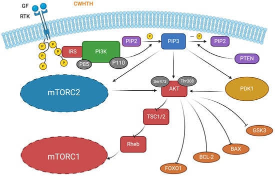 The PI3K/Akt/mTOR pathway is responsible for various cellular activities, including cell activation, growth, proliferation, and apoptosis [114]. The scheme of the PI3K/Akt/mTOR signaling pathway is illustrated in Figure 5. To elucidate the scheme of the pathway, the activation of PI3K (consisting of P85 and P110) occurs when the ligand binds to cell surface tyrosine kinase receptors (RTKs), thereby triggering its phosphorylation with the signaling adaptor protein (insulin receptor substrate, IRS). Activated PI3K can phosphorylate the phosphatidylinositol 4,5-bisphosphate (PIP2), converting it to phosphatidyl-inositol 3,4,5 triphosphate (PIP3) [115]. Meanwhile, the phosphatase and tensin homolog (PTEN), a specific PIP3 phosphatase, can dephosphorylate PIP3, reconverting it to PIP2 [116]. The activated PIP3 recruits two protein kinases, protein kinase B (Akt) and phosphoinositide-dependent protein kinase 1 (PDK1), to the plasma membrane. The Ser473 and Thr308 of Akt can be phosphorylated by the mammalian target of rapamycin complex 1 (mTORC1) and PDK1, respectively. Then, activated Akt phosphorylates tuberous sclerosis complex 2 (TSC2), inhibiting tuberous sclerosis complex 1/2 (TSC1/TSC2) complex activity. Previously, the active TSC1/TSC2 complex could inhibit the activity of Ras homolog enriched in the brain (Rheb), which in turn inhibited the activity of mTORC1. Thus, sequential inhibition enables activated Akt to activate the activity of mTORC1, further activating its downstream effectors. Meanwhile, the mammalian target of rapamycin complex 2 (mTORC2) is required for the full activation of Akt. Activated Akt inhibits forkhead box protein O1 (FOXO1), which controls cell survival. Glycogen synthase kinase 3 (GSK3) controls cell proliferation, while Bcl-2 and Bax can control apoptosis [114,117,118,119].