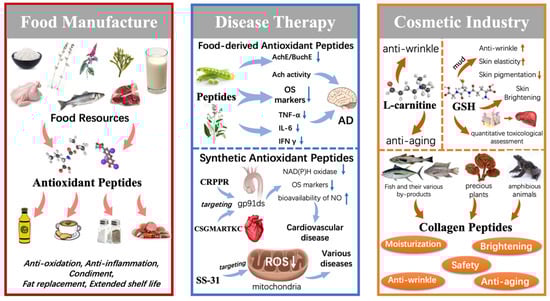 Finally, the application of antioxidant peptides focuses on food manufacturing, therapy, and the cosmetic industry. A systematic review is urgently required to summarize the applications of antioxidant peptides. This review focuses on the specific products of antioxidant peptides in food manufacture. Moreover, food-derived and synthetically designed antioxidant peptides possess different characteristics in therapy, so a comparison is needed. Finally, the applications of antioxidant peptides in the cosmetic industry focus on L-carnitine, glutathione (GSH), and collagen peptides, which have been widely used.