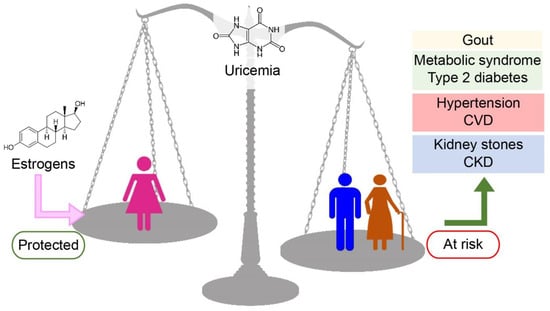 - Halperin Kuhns, V.L.; Woodward, O.M. Sex Differences in Urate Handling. Int. J. Mol. Sci. 2020, 21, 4269. [Google Scholar] [CrossRef] [PubMed]