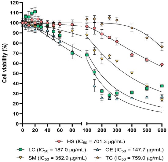 LC and OE extracts exhibited the highest cytotoxicity, and both treatments resulted in a statistically significant reduction in cell viability from 40 µg/mL. IC50 was estimated as 187 µg/mL for LC and 147.4 µg/mL for OE. In the case of the SM extract, cytotoxic effects were statistically significant from 60 µg/mL, and IC50 was 352.9 µg/mL. With the HS treatment, cell viability was decreased from 200 µg/mL with statistical significance, and calculated IC50 was 701.3 µg/mL for this extract, which did not reduce cell viability in a significant manner up to 400 µg/mL and whose IC50 was 759 µg/mL.