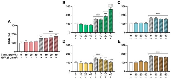 Antioxidant activity. ROS levels were measured as described in methods section. Significance was established at p < 0.05. ** (p < 0.01), *** (p < 0.001), and **** (p < 0.0001) are in the figures and indicate statistically significant differences compared to the nontreated and nonirradiated control. ### (p < 0.001), and #### (p < 0.0001) indicate statistically significant differences compared to the nontreated irradiated control. (A): Hibiscus sabdariffa; (B): Lippia citriodora; (C): Olea europaea; (D): Silybum marianum; (E): Theobroma cacao.