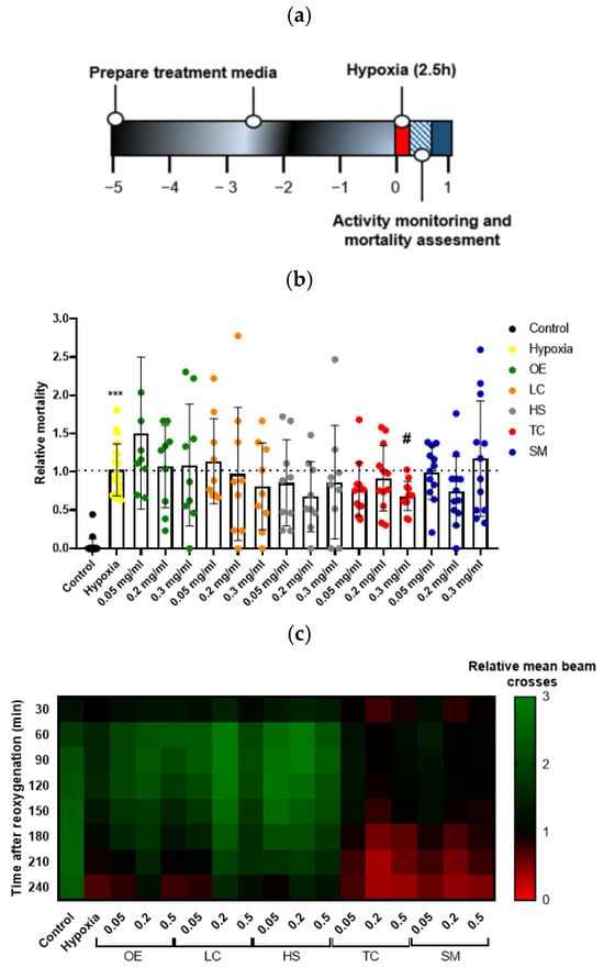 Effect of plant extract supplementation on Drosophila melanogaster exposed to severe hypoxia. (a) Schematic illustration of the hypoxia protocol in flies. (b) Effect of the treatment on fly survival after exposure to 1% O2 for 2.5 h. Data were analyzed using one-way ANOVA test followed by Dunnett´s multiple comparisons test *** p < 0.001 vs. control; # p < 0.05 vs. hypoxia. (c) Heatmap displaying the locomotor activity of treated flies. Flies were transferred into the monitor immediately after hypoxia and the activity was recorded for 240 min after reperfusion. Each cell shows the mean beam crosses per fly in the group.