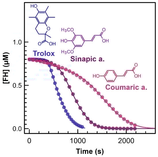 Figure 1 shows the simulation and fitting of the fluorescein bleaching curves using the kinetic model described in Table 1. This figure demonstrates a high correlation between the predicted and observed fluorescein bleaching curves in the presence of three antioxidants, specifically Trolox, sinapic acid, and coumaric acid. Notably, the experimental curves are consistent with those reported in previous studies by Dorta et al. [10,28], proving the reproducibility of the findings. The simulated curves fit the experimental data, with R2 values greater than 0.99. This accurate fitting was achieved by optimizing three key parameters, as reported in Table 3: the rate constants k5 and k6, which are crucial in expressing the reactivity of the antioxidants, and the initial concentration of antioxidants, which indicates the stoichiometry (Equation (2)). These parameters were estimated using the iterative fitting procedure, with uncertainties always below 5%, whereas experimental replicates exhibited uncertainty of less than 15%. The significance of these three parameters in the context of antioxidant characterization is discussed in the following sections.