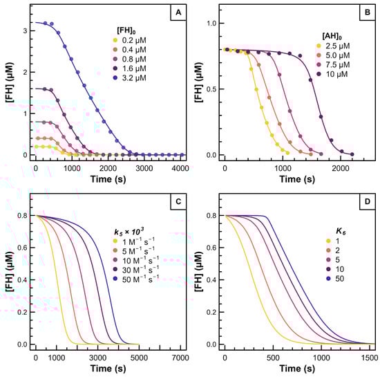 The repair efficiency is expressed by the equilibrium constant (K6, see Reaction (6)). The K6 value was obtained by fixing the backward rate constant k−6 as 106 M−1 s−1, while the forward rate constant k6 was iteratively optimized via fitting procedures. Subsequently, the equilibrium constant K6 was determined using Equation (3).