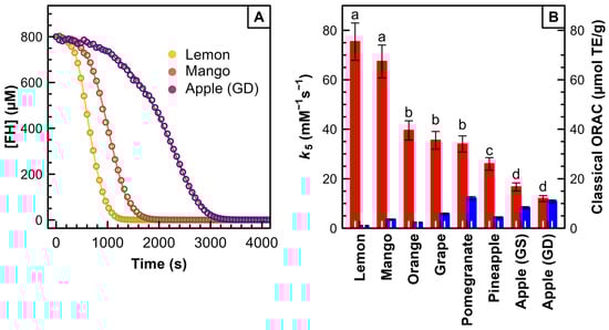 (A) Experimental (dots) and simulated (lines) fluorescein bleaching curves in the presence of different fruit juices. Experimental conditions as in Figure 1; (B) Values of k5 versus the classical ORAC determined for different raw fruit juices. Legend: GD: Golden Delicious cv.; GS: Granny Smith cv. Letters (a, b, c, d) indicate groups statistically differentiated by Tukey’s HSD test. Groups sharing a letter do not significantly differ (p ≥ 0.05). Distinct letters signify significant differences between group means (p < 0.05).