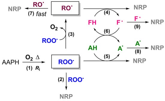 Scheme of the reaction mechanism describing the ORAC assay. Legend: AAPH is the free radical initiator 2,2′-azobis(2-methylpropionamidine) dihydrochloride; RO• and ROO• are alkoxyl and peroxyl radicals, respectively; AH is an antioxidant; FH is fluorescein; A• and F• are the oxidized forms of antioxidant and fluorescein, respectively; and NRP is a non-radical product.