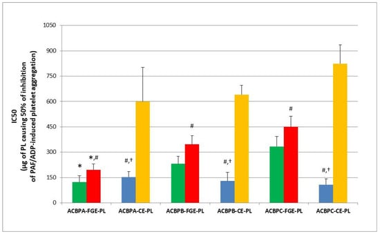 The anti-inflammatory and anti-platelet potency of food-grade extracted PLs (ACBP-FGE-PL) of apple cider by-products (ACBP) from low (ACBPA), intermediate (ACBPB) and high (ACBPC) tannin-content apple pomace, versus that of PLs extracted from these ACBP with conventional extraction methods (ACBP-CE-PL), against human platelet aggregation induced via the inflammatory and thrombotic mediator PAF (green bars depict the anti-PAF activities of ACBP-FGE-PL and blue bars those of ACBP-CE-PL) or by the platelet agonist ADP (red bars depict the anti-ADP activities of ACBP-FGE-PL and yellow bars those of ACBP-CE-PL), respectively. Results are expressed as means of the IC50 values in µg of PL in the aggregometer cuvette that causes the 50% inhibition of PAF/ADP-induced platelet aggregation (the lower the IC50 value for an extract, the higher its inhibitory effect against the specific agonist of platelet aggregation) (n = 6). * Denotes statistically significant difference (p < 0.05) when the anti-PAF potency (IC50 value) of the bioactive ACBP-FGE-PL of the low-in-tannins ACBPA (ACBPA-FGE-PL) were compared with that of the ACBP-FGE-PL from the other two ACBPs with higher tannin contents (ACBPB-FGE-PL and ACBPC-FGE-PL). # denotes statistically significant difference (p < 0.05) when the anti-PAF and the anti-ADP potencies (IC50 values) of the bioactive ACBP-FGE-PL were compared to those of the ACBP-CE-PL from the same ACBP. † denotes statistically significant difference (p < 0.05) when the anti-PAF potency was compared to the anti-ADP potency (IC50 values) of the bioactive ACBP-FGE-PL or the ACBP-CE-PL of the same ACBP. Results for the IC50 values against both PAF and ADP for the ACBP-CE-PL from all three types of ACBP (blue and yellow bars) are reproduced from [] for facilitating comparisons.