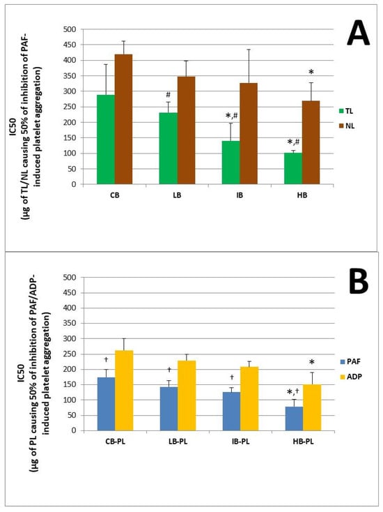 The anti-inflammatory and anti-platelet potency of lipid bioactives from the novel functional whole-grain breads infused with several concentrations of the low-in-tannins ACBPA-FGE-PLs bioactives against human platelet aggregation induced via the inflammatory and thrombotic mediator PAF or by a classic platelet agonist, ADP. (A) depicts the anti-PAF potency (IC50 values) of the total lipids (TL; green bars) and neutral lipids (NL; brown bars) extracted and separated from the novel functional whole-grain breads containing low (LB), intermediate (IB) and high (HB) contents (concentrations) of the infused ACBPA-FGE-PL bioactives, versus control whole-grain bread (CB) that was not infused with ACBPA-FGE-PL bioactives. (B) depicts the anti-PAF (blue bars) and anti-ADP (yellow bars) potency (IC50 values) of the bio-functional polar lipids (PL) extracted and separated from novel functional whole-grain LB, IB and HB breads that were infused with ACBPA-FGE-PL bioactives, versus control whole-grain CB bread. Results are expressed as means of the IC50 (half-maximal inhibitory concentrations) values in µg of bread lipid extract in the aggregometer cuvette that causes the 50% inhibition of PAF/ADP-induced platelet aggregation (the lower the IC50 value for a lipid extract the higher its inhibitory effect against the specific agonist of platelet aggregation). * denotes statistically significant difference (p < 0.05) when the anti-PAF or anti-ADP potency (IC50 value) of the bioactive TLs and NLs (A) or PLs (B) of the HB and IB breads are compared with those of the other two breads (CB and LB). # denotes statistically significant difference (p < 0.05) when the anti-PAF effects of the TL bioactives were compared with those of the NL within the same bread samples. † denotes statistically significant difference (p < 0.05) when the anti-PAF potency of the PL bioactives was compared to their anti-ADP potency (IC50 values) within the same bread sample. (n = 6).