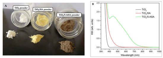 (A) The photo images of pristine TiO2 powder (white) and inorganic–organic hybrids surface-modified with salicylic acid (TiO2/SA) (yellow) and 5-aminosalicylic acid (TiO2/5-ASA) (brown). (B) The Kubelka–Munk transformations of diffuse reflection data for the unmodified TiO2 powder and surface-modified TiO2 powders.