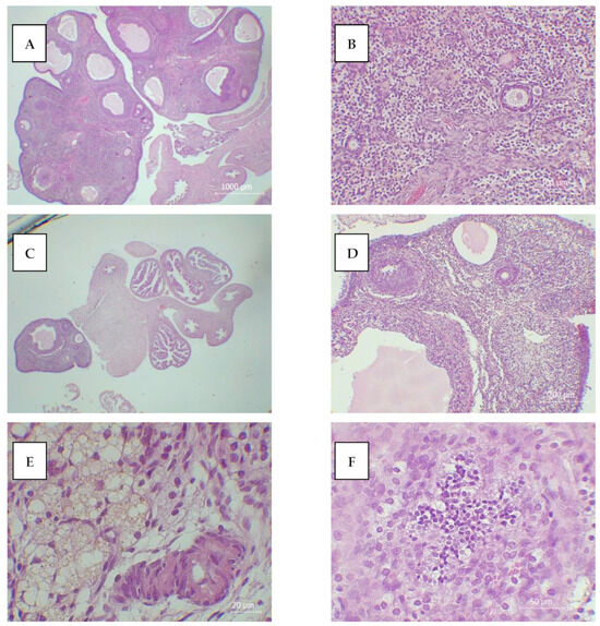 Our results, presented in Figure 2 and Table 2 and Table 3, depict the histological changes in the ovaries and fractional contribution of the ovaries, oviducts, and uterus to the overall body mass, hormone status, and tumor marker levels 14 days after acute oral applications of TiO2 NPs, TiO2/SA, and TiO2/5-ASA. Before the treatments, all 36 rats had regular estrus cycles of 4 days, synchronized within cages, and generally, a uniform distribution of the different estrous phases/days. Following the vehicle treatment, the animals retained a normal estrus cycle lasting 4 days with a normal development of primary and secondary follicles (Figure 2A,B).