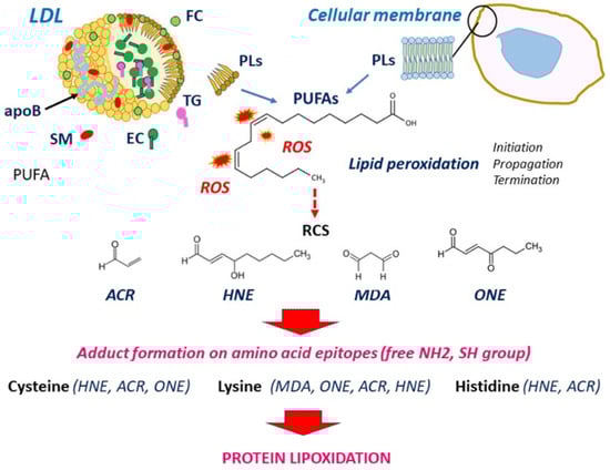 LDL oxidation in the vascular wall is a complex mechanism that involves several sources of ROS, including NOXs (NADPH oxidases), the mitochondrial electron transport chain, xanthine oxidase, myeloperoxidase, cellular lipoxygenases, uncoupled eNOS, heme, iron, and copper ions [,,,,]. Lipid peroxidation strongly affects polyunsaturated fatty acids (PUFAs) in three steps (initiation, propagation, and termination), with hydrogen abstraction from a carbon and oxygen insertion [,]. This peroxidative attack generates a huge variety of lipid peroxidation products, among them lipid peroxyl radicals and lipid hydroperoxides, which undergo structural rearrangements to form RCS [,,,]. Protein lipoxidation refers to the non-enzymatic post-translational modification of proteins by RCS via their interaction with the nucleophilic side chains of cysteine, histidine, and lysine residues to form Schiff’s bases (addition of the aldehydic group to an amino group of protein), or Michael addition of a nucleophile to α, β-unsaturated aldehydes [,]. The formation of RCS adducts is very fast, relatively selective, and depends on the protein microenvironment and the specific epitope exposure. The chemistry of adduct formation on proteins, as well as the reversion mechanisms (conjugation with glutathione catalyzed by glutathione S-transferase, oxidation or reduction by aldehyde dehydrogenase or alcohol dehydrogenase), have been largely described and reviewed [,,,,].