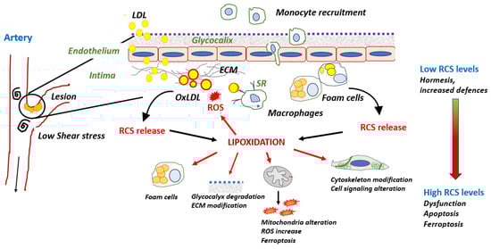 This review is focused on protein lipoxidation in the vascular wall and its implication in atherogenesis, and to a lesser extent, in advanced plaques. To better understand how and when RCS contribute to these processes, the following section briefly summarizes the different stages of atherosclerosis, with the role of RCS being developed subsequently.