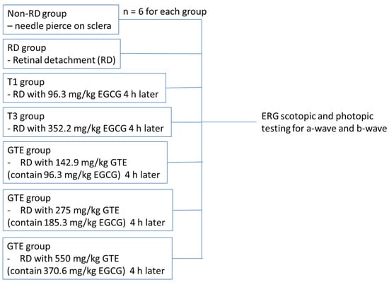 Rats from each group were dark-adapted for at least 12 h before electroretinography (ERG). Two batches of rats were tested. The first batch compared the non-RD group, RD, and EGCG treatment group at 96.3 mg/kg and 352.2 mg/kg, and the GTE treatment group at 142.9 mg/kg (contained 96.3 mg/kg EGCG) four hours after RD. The second batch compared non-RD, RD, and GTE treatment groups at 275 mg/kg (contained 185.3 mg/kg EGCG) and 550 mg/kg (contained 370.6 mg/kg EGCG) four hours after RD (Figure 4). The rats were anesthetized by i.p. injection with a ketamine (100 mg/kg)/xylazine (10 mg/kg) mixture. The pupils were dilated with 0.5% tropicamide and 0.5% phenylephrine hydrochloride eye drops, and the eyes were anesthetized with 0.5% w/v proxymetacaine HCL for ERG examination. The body temperature was kept at 37 °C with a heating pad. ERGs were recorded with a corneal gold wire electrode with a reference electrode at the mouth and grounded in the tail. The amplitude of the b-wave was measured from the trough of the a-wave to the peak of the b-wave in both eyes from each group.