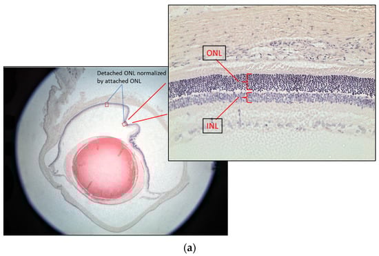 The rat eyes were enucleated after three days of treatments. They were fixed in neutral buffered 10% paraformaldehyde overnight. After paraffin embedding, the retina was sectioned from ora serrata to the optic nerve at 5 μm thickness followed by Hematoxylin-Eosin (H&E) staining for the retinal layer measurement. Three rats from each group were used for the test. Two eyes from each rat were enucleated for sectioning. Ten sections from each eye were used to calculate the normalized outer nuclear layer (ONL) thickness. Since the retinal thickness changes with distance from the optic nerve and the retinal thickness varies between individuals, the thickness of the inner nuclear layer (INL) was used to control the ONL measurements [9] (Figure 3a). The ONL thickness was used as an indicator of retinal damage because it has been found that the ONL is disorganized, but there was no significant change in the INL at 7 days after RD [10]. The attached retina was used to further control the detached retina [11]. The thickness of the normalized ONL was used for comparison as follows: