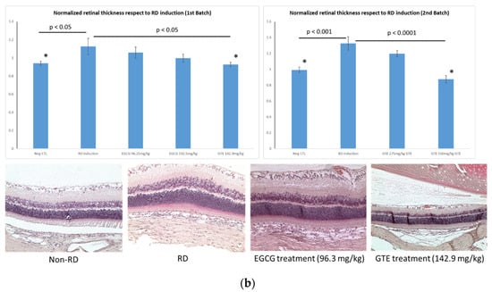 The detached retina’s swelling after the RD lesion was shown by the thickness of normalized ONL of the detached retina, which was thicker than the non-RD and the other treatment group (Figure 3 and Supplementary Tables S1 and S2). The average normalized ONL thickness of the detached retina from the GTE group at 142.9 and 550 mg/kg was significantly thinner than the RD group with 82.4 ± 8.2% (Mean ± SEM, p < 0.05) and 66.0 ± 8.2% (Mean ± SEM, p < 0.05), respectively, compared to the thickness in RD from the two batches. The thickness at a low dose of GTE was similar to that in non-RD conditions with 83.5 ± 4.7% (Mean ± SEM). The other treatments did not show significant changes, although they appeared thinner than the RD group (p < 0.05, n = 6).