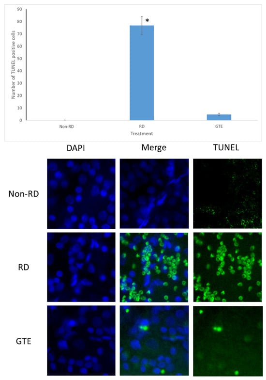 TUNEL test after RD. The representative diagram shows the number of TUNEL-positive cells increased three days after RD but decreased with GTE treatment. The number of TUNEL-positive cells significantly increased in the RD group compared to the non-RD group but significantly decreased compared to the GTE treatment group (142.9 mg/kg). *—significant difference (p < 0.0001, n = 6). Error bar: - ± SEM. Magnification 10 × 40.