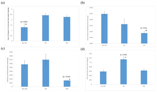 Comparison of (a) caspase-3, (b) sphingomyelin, (c) protein carbonyl, and (d) HIF-1α levels in the retina in non-RD, RD, and GTE treatment groups (142.9 mg/kg). *—indicates a significant difference compared to the other groups (p < 0.05, n = 6). Error bar: - ± SEM.