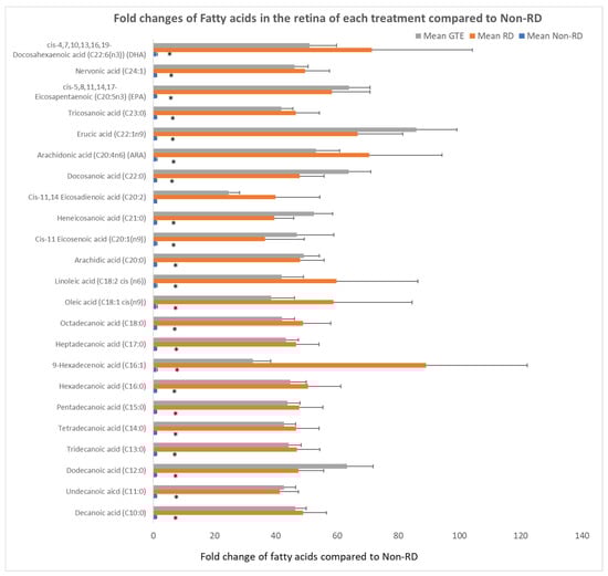 Comparison of fold changes of fatty acid levels of the retina in each group to the non-RD group. The levels of fatty acid were normalized by total protein in each retina. * denotes a significant difference in the levels of fatty acids amongst the groups. Error bar: - ± SEM. *: (p < 0.05, n = 10).