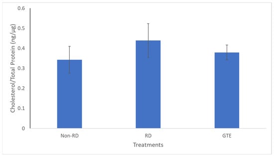 Comparison of the cholesterol level in the retinae between the non-RD, RD, and low-dose GTE treatment groups. The cholesterol level was normalized by total protein in each retina. There was no significant difference between the groups. Error bar: - ± SEM.
