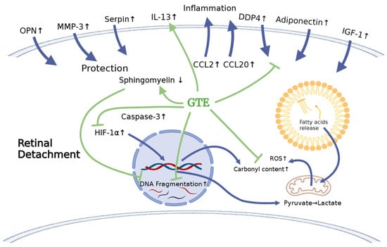 The schematic diagram shows the effects of retinal detachment on the endogenous molecule expression that explains the subsequent physiological effects, including the increase in oxidation, inflammation, and apoptosis. It delineates how the treatment with green tea extract relieves stress. The blue arrows indicate the production of cytokines and metabolites and their infiltration after RD induction. The green arrows indicate the effects of GTE on cytokines after GTE treatment. The green blunt arrows indicate the inhibition effects of GTE on cytokines and metabolite production.
