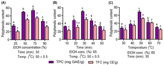 Effect of (A) ethanol concentration; (B) extraction time; and (C) extraction temperature on UMS extraction on ethanol concentration, time and temperature single factor on the yield of TPC and TFC of UMS extract. Different letters represent statistical significance (p < 0.05) between each group. (a, b, c and d for TPC; x, y and z for TFC).
