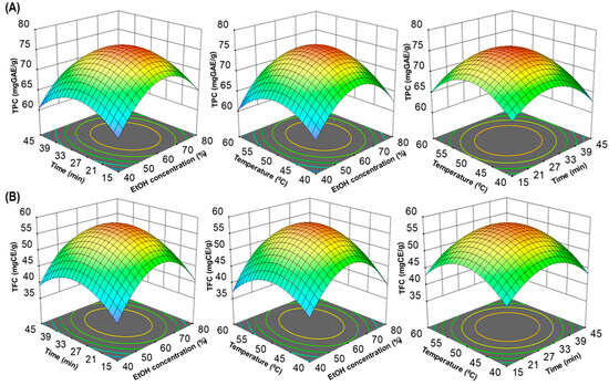 In addition, to visualize interactions between independent variables, 3D surfaces and contour plots were generated using multiple linear regression equations. These graphical representations (Figure 2A,B) help elucidate the main and cross-product effects of independent variables on the response variables, enhancing the understanding of the underlying processes. This comprehensive statistical analysis supports the robustness and validity of the model for predicting total polyphenolic extraction yields. The three-dimensional response surface analysis in RSM examined the relationship between TPC, TFC and extraction parameters. Contour plot shapes conveyed the significance of mutual interactions. Elliptical contours implied negligible interactions, while circular contours indicated significant interactions [22,25]. In Figure 2A,B, all response surfaces were convex, affirming the appropriate selection of variable ranges for ultrasonic time, temperature and ethanol concentration, highlighting their collective impact on TPC and TFC extraction yields.