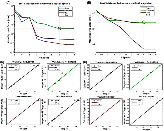 The ANN model effectively captured the nonlinear relationships between extraction parameters (X1, X2 and X3) and response variables (Y1 and Y2), as evidenced in Figure 3A–D. Like RSM, the fitness and significance of the ANN model relied on various parameters, including R2 values for training, validation, testing, overall error reduction and the number of epochs to prevent overfitting or underfitting. Notably, the best validation performance for TPC occurred at epoch 6, and for TFC at epoch 4 (Figure 3A,B). Furthermore, high R2 values exceeding 0.97224 for TPC and 0.99998 for TFC (Figure 3C,D) underscore the model’s precision and its potential to accurately represent the complex relationships between the variables.