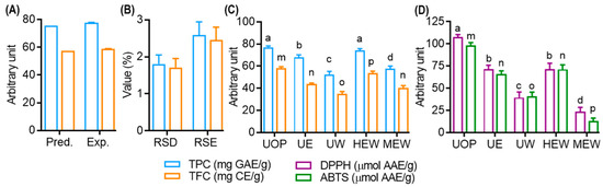 Model validation and comparative study of TPC and TFC of various extraction methods. (A) TPC and TFC value of optimized condition. (B) Relative standard deviation (RSD) and relative standard error (RSE) value of optimized condition. (C) Effect of various extraction techniques on the yield of TPC and TFC of UMS extract. (D) Effect of various extraction techniques on the DPPH and ABTS radical scavenging effects of UMS extract. Different letters represent statistical significance (p < 0.05) between each group. (a, b, c and d for TPC; m, n, o, and p for TFC). U: ultrasonic assisted extraction; H: heat assisted extraction; M: maceration extract; OP: optimized condition; E: 100% EtOH; W: 100% aqueous; EW: 75% EtOH; AAE: ascorbic acid equivalent.