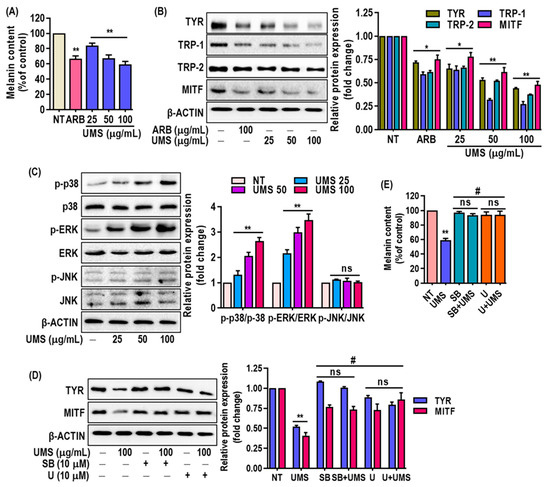 Effects of UMS on melanogenesis in MNT-1 cells. Cells were cultured with UMS (25–100 μg/mL) for 3 days. (A) Melanin content was determined. Western blot analysis of (B) melanogenesis factors such as Tyr, Trp-1, -2 and MITF, (C) MAPK proteins including p38, ERK and JNK. MNT-1 cells were co-treated with UMS and selective inhibitors of ERK (U0126) and p38 (SB239063). (D) MITF and Tyr levels were determined by western blot analysis, and (E) melanin content was also determined. * p < 0.05, ** p < 0.01 vs. NT, # p < 0.01 vs. UMS alone, ns: non-significant vs. NT, ARB: arbutin.