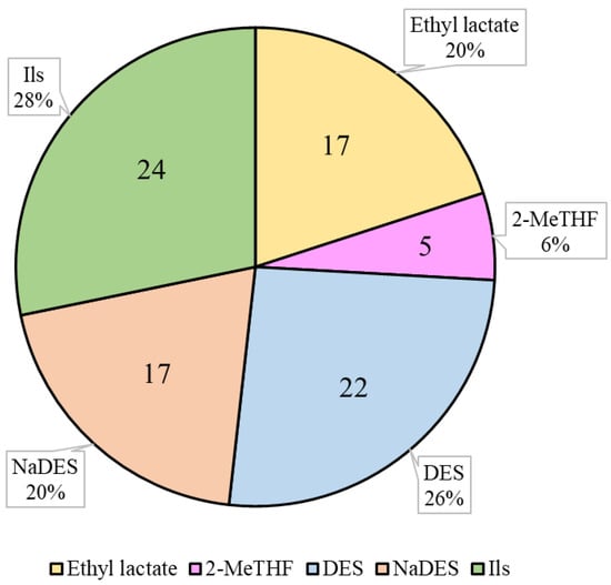 Number (inside the chart) and percentage (outside the chart) of published research articles related to carotenoid extraction using the respective solvent. 2-MeTHF: 2-Methyltetrahydrofuran; DES: deep eutectic solvent; NaDES: natural deep eutectic solvent; ILs: ionic liquids. Source for article search: Scopus.