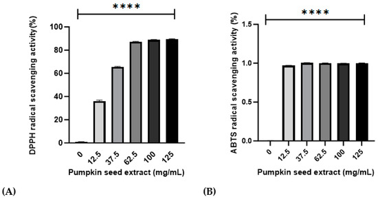 Effects of pumpkin seed extract (12.5, 37.5, 63.5, 100, and 125 mg/mL) on DPPH and ABTS radical-scavenging activities. (A) DPPH radical-scavenging activity (%). (B) ABTS radical-scavenging activity (%). Data are expressed as the mean ± SD (**** p < 0.0001 vs. 0 mg/mL).