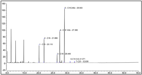 We performed GC-MS analysis to identify compounds present in pumpkin seed extracts, and the data of which are shown in Figure 3 and Table 2. Chromatographic profiles revealed seven compounds in the extract, among which we identified saturated, monounsaturated, and polyunsaturated fatty acids, including palmitic (hexadecanoic acid), stearic (octadecanoic acid), oleic (Omega-9), linoleic (Omega-6), alpha-linolenic (Omega-3), and arachidic (icosanoic) acids, and among which, oleic acid (23.40%), linoleic acid (39.94%), and alpha-linolenic acid (0.23%) are essential fatty acids.