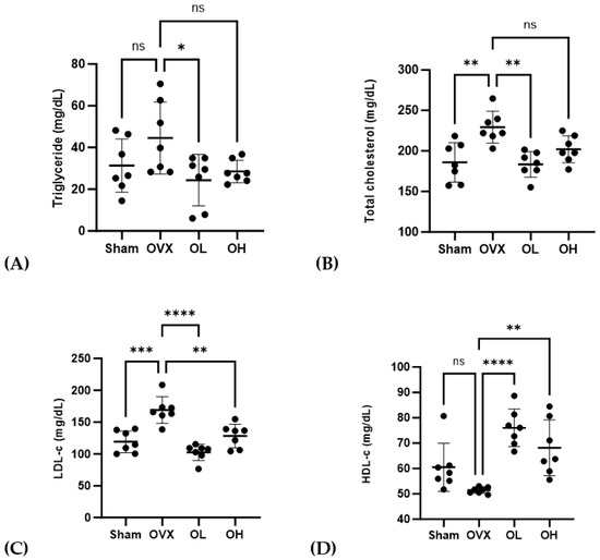 Effects of pumpkin seed extract on serum lipid profiles. (A) Triglycerides. (B) Total cholesterol. (C) Low-density lipoprotein-cholesterol (LDL-c). (D) High-density lipoprotein-cholesterol (HDL-c). Data are expressed as mean ± SD (**** p < 0.0001, *** p < 0.001, ** p < 0.01, * p < 0.05 vs. OVX). ns: non-significant.