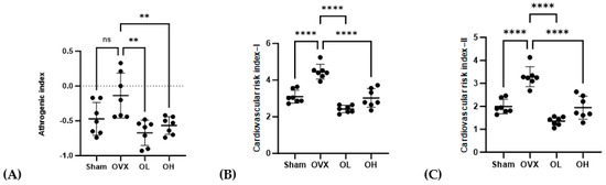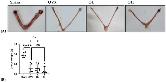 After overnight fasting, the rats were euthanized with CO2. Blood samples were collected in 5 mL serum separator tubes and centrifuged at 1902× g for 30 min (Combi-514R, Hanil Co. Ltd., Seoul, Republic of Korea), and the supernatant was stored in a deep freezer (DF8517, Ilshin Laboratory Co., Ltd., Seoul, Republic of Korea) at −70 °C until use. Liver, lungs, kidneys, abdominal fat (ABF), uterus, uterine fat (UF), brown adipose tissue (BAT), and subcutaneous fat (SCF) were removed and weighed.