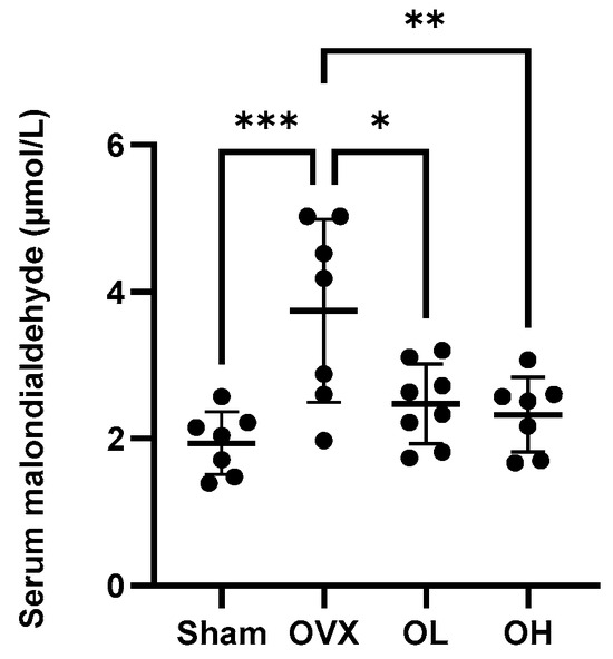 The levels of malondialdehyde (MDA), a marker of oxidative stress, in the serum were measured using an MDA ELISA kit (E-EL-0060; Elabscience, Wuhan, China), according to the manufacturer’s instructions.