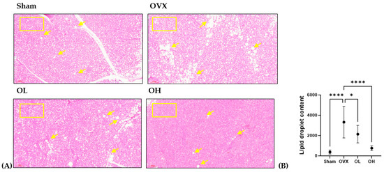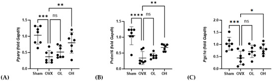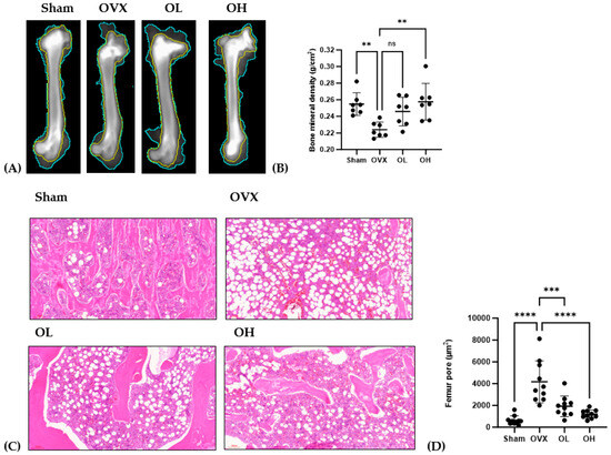 The weights of ABF, UF, BAT, and SCF are shown in Figure 7. OVX group had the highest ABF weight (p < 0.001). OVX group had significantly higher weights of UF and SCF (p < 0.05, p < 0.01) than those of Sham and OH groups and significantly higher weights of BAT than those of OL and OH groups (p < 0.01). The OH group showed a significantly lower fat weight than the OVX group (p < 0.01).