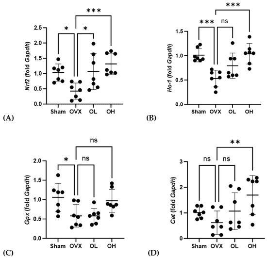 Both aging and the menopausal period are associated with increases in oxidative stress and excessive ROS production, which are deleterious to liver and cardiovascular functions [42]. Pumpkin seed extract ameliorates oxidative stress caused by menopause and aging, playing an antioxidative role in cardiovascular diseases, triglyceride accumulation in the body, and dysfunction in energy generation [42,44]. Consistently, in the present study, we found that the administration of pumpkin seed extract contributed to a reduction in the levels of lipid peroxidation, as assessed by an analysis of serum MDA levels [45]. Nrf2 is a transcription factor that regulates cellular redox status and is involved in the maintenance of homeostasis; Nrf2 levels are upregulated under oxidative stress but are reduced with aging [46]. Ho-1 protects cells from oxidative stress, and its levels are reduced due to estrogen deficiency during menopause [47,48]. Cat is an antioxidant enzyme that reduces oxidative stress by catabolizing ROS [49]. In the present study, we evaluated the mRNA expression of these enzymes in ovariectomized rats treated with pumpkin seed extract, and accordingly detected the upregulated expression of all three enzymes, which would thereby contribute to the protection of cells from oxidative stress and the enhancement of the catabolism of ROS.